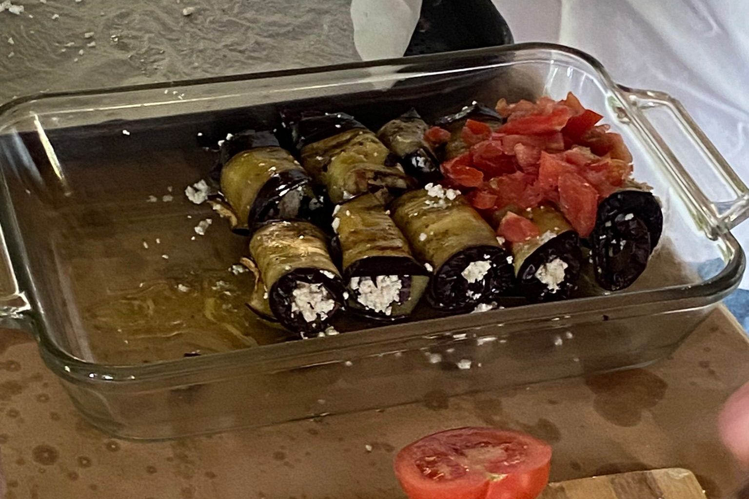 - Daha sonra her bir patlıcan parçasının içine lor peyniri ve fesleğen koyun. Bu patlıcan rulo sarmalarını güzelce yağladığınız fırın kabınıza koyun. Üstüne de ister kavanozladığınız kışlık domates, isterseniz de taze kestiğiniz yazlık domatesleri dökün. Domatesin içine bir iki diş sarımsak da rendeleyin! Şifa niyetine 😉